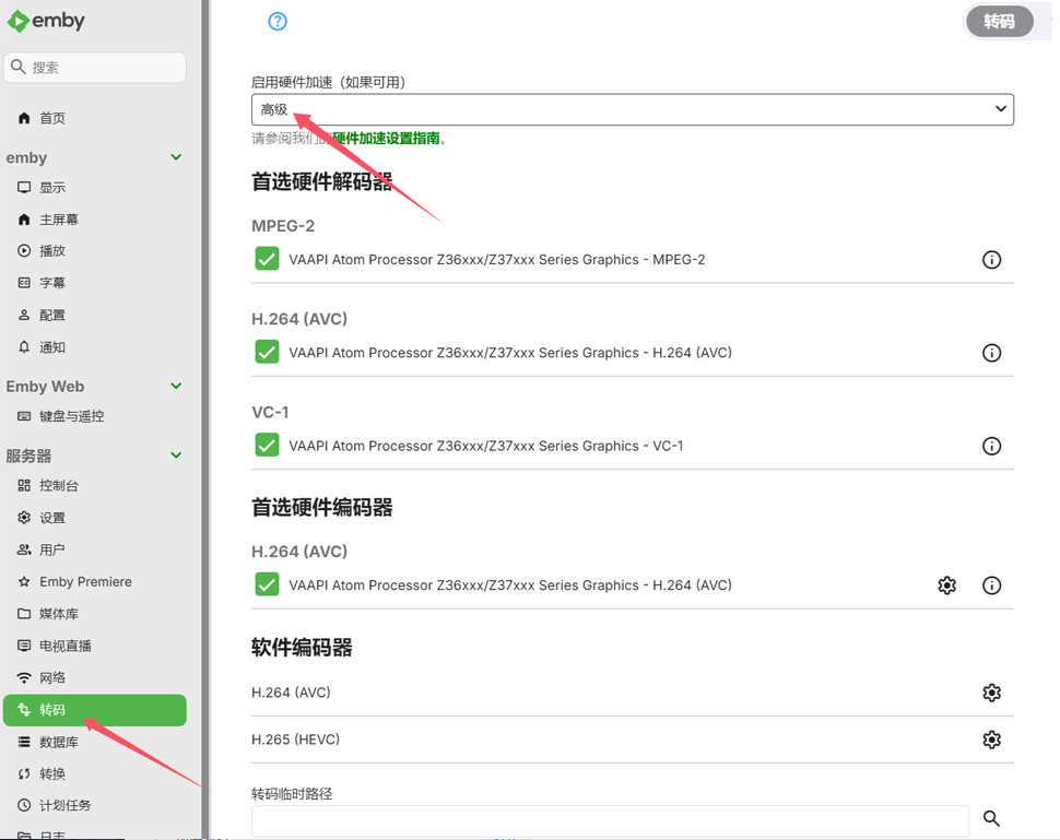 左侧点击转码,然后选择高级就会显示核显型号,播放时候会自动核显转码