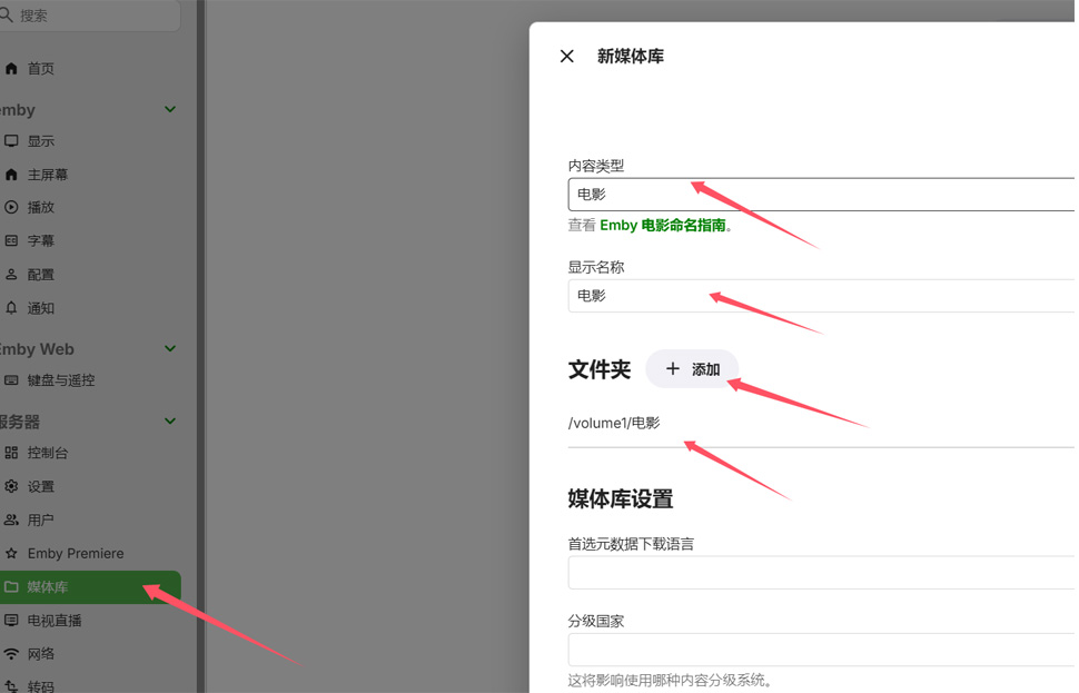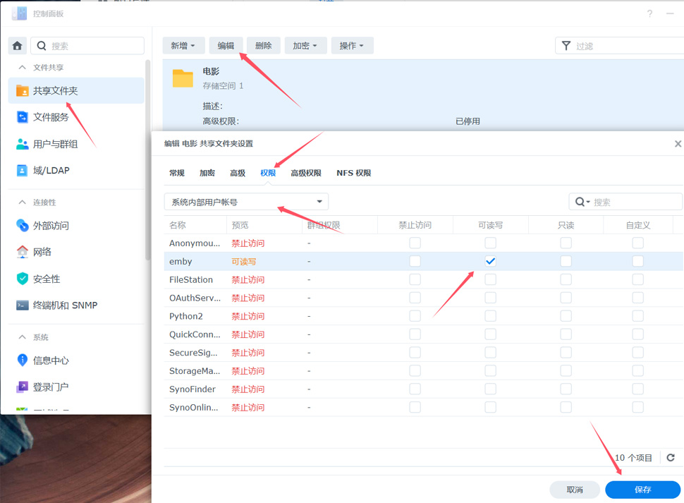 这里将群晖电影文件给emby权限,这样emby才会读取到里面电影数据