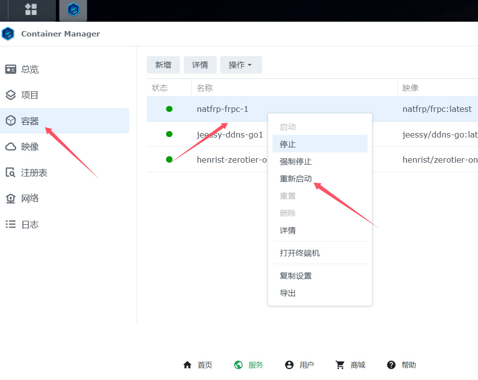 先用内网IP登录群晖打开docker容器右击重启natfrp